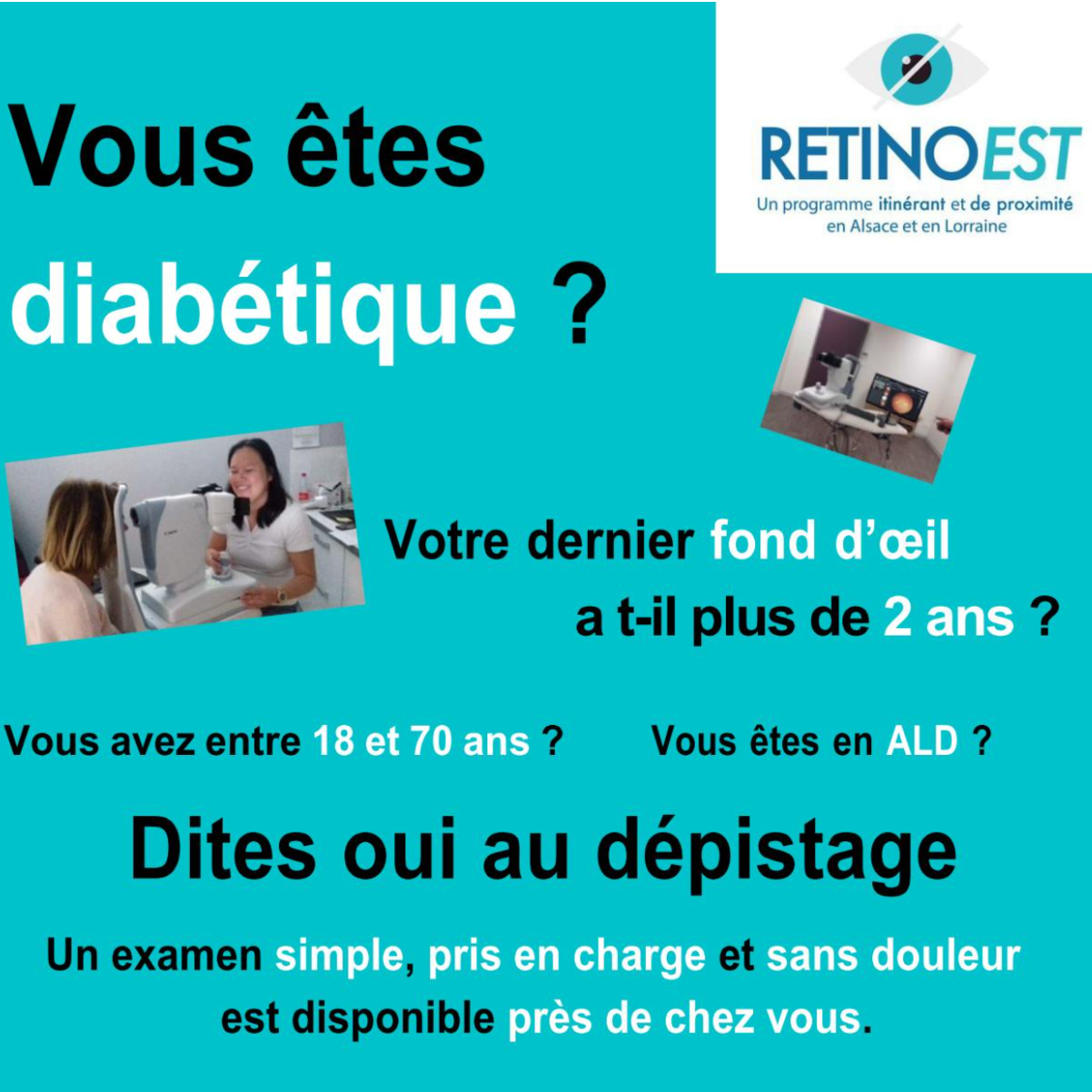 Dans le cadre du programme de dépistage itinérant de la rétinopathie diabétique, une journée de dépistage est proposée par RETINOTESTà Guebwiller le lundi 11 mai 2026, au cabinet d'orthoptie de David Fernandes, situé 12 B rue Théodore Deck.