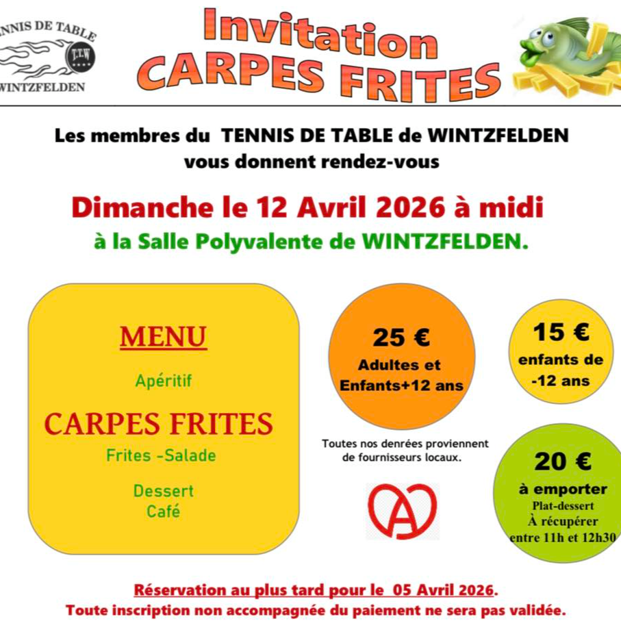 Le Tennis de table de Wintzfelden vous invite à son traditionnel repas de carpes fritesdimanche 12 avril à midi à la salle polyvalente de Wintzfelden.