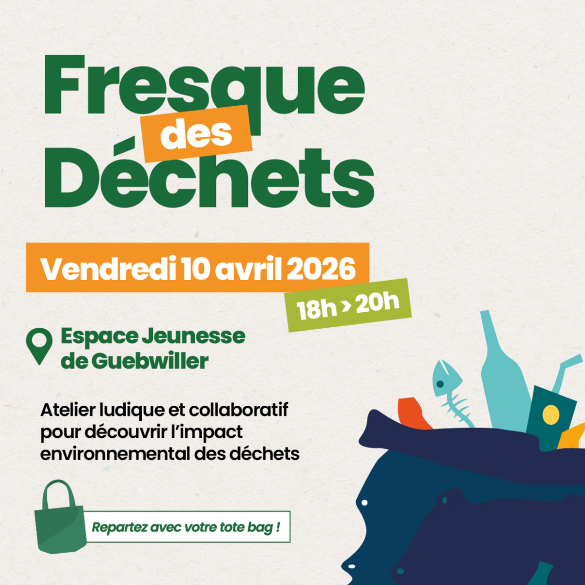 La Communauté de Communes de la Région de Guebwiller et ses partenaires proposent une première animation grand public autour de la réduction des déchets vendredi 10 avril de 18 h à 20 h, Guebwiller.